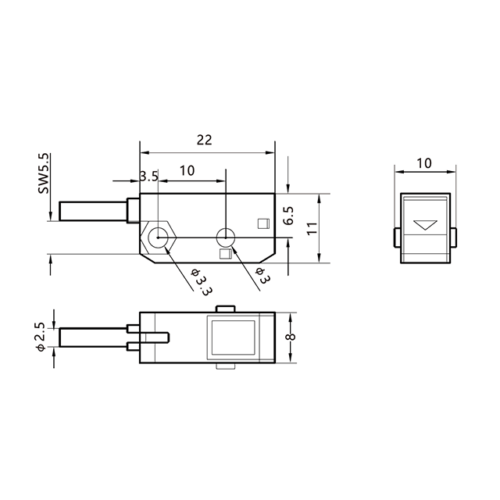 Компактный корпус (22×11×10 мм), кабельное подключение и яркие LED-индикаторы (питание – желтый, выход – красный) делают его удобным для установки и диагностики. Датчик использует инфракрасный ИК-светодиод с длиной волны 940 нм, обеспечивающий стабильную работу даже в условиях внешней засветки. Электрическая часть построена на выходе NPN (Light on), поддерживает ток нагрузки до 100 мА и защищена от коротких замыканий и переполюсовки. Степень защиты IP40 указывает на то, что PTJ-T150PC-I ориентирован на применение в защищенных от пыли и влаги помещениях. Прекрасный выбор для задач с точной фиксацией предметов на производстве.